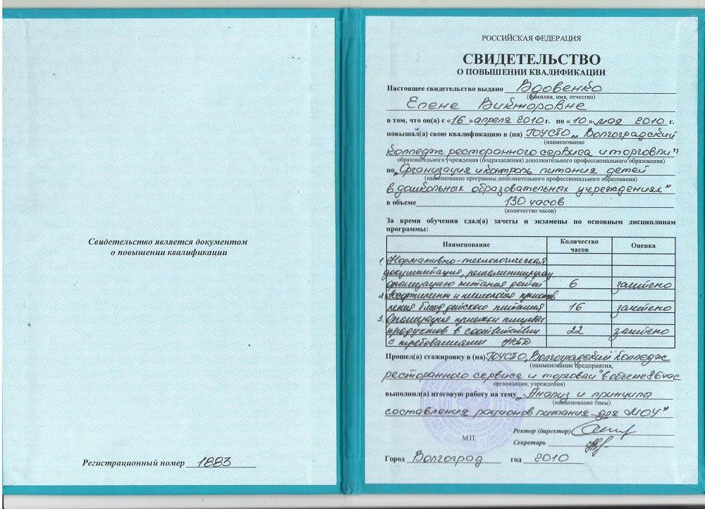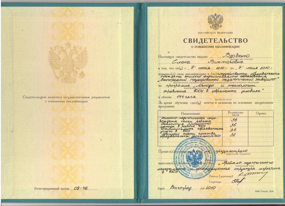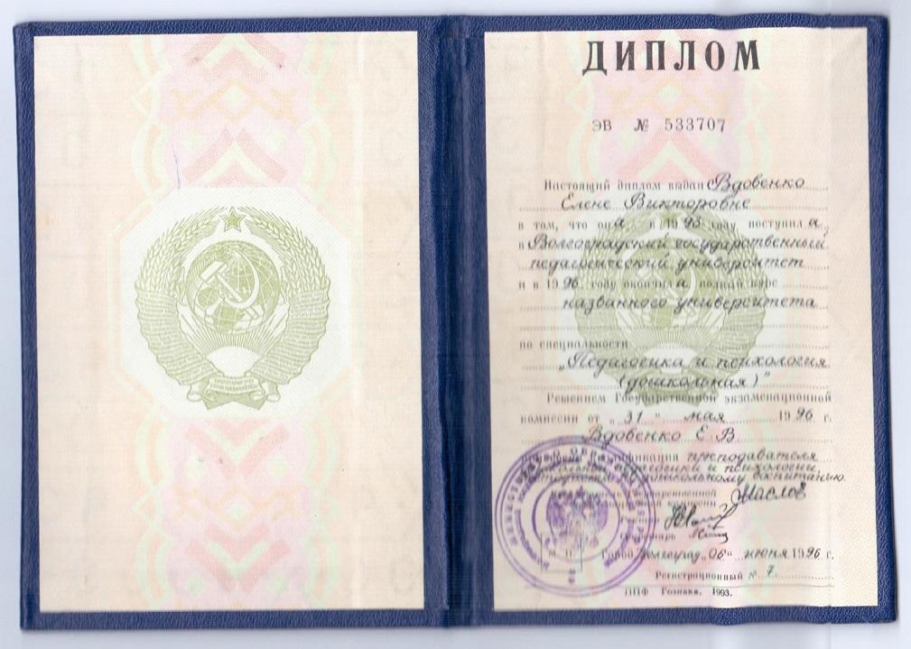 Среднее профессиональное, Волгоградское педагогическое училище №1. Квалификация - "Воспитатель в дошкольных учреждениях" по специальности "Воспитание в дошкольных учреждениях", 1991 г. Высшее профессиональное, Волгоградский государственный педагогический университет. Квалификация - "Преподаватель дошкольной педагогики и психологии, методист по дошкольному воспитанию" по специальности "Психология и педагогика (дошкольная)", 1996 г.